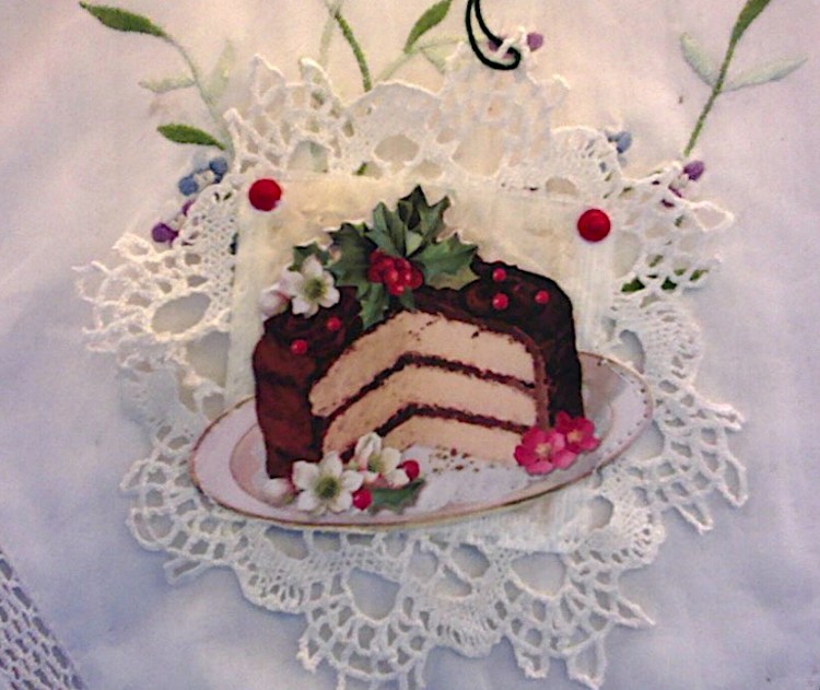 This evening I did manage to push through my ennui and created another tea bag charm, this one featuring a Christmas cake. I stitched the tea bag to a lovely little doily, so didn’t have to glue to the fabric. EnJoy!