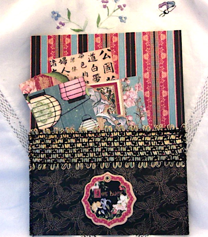 I worked on my fabric and lace journal cover this evening, and will show photos when it’s finished. Meanwhile, here is another paper pocket I made from a scrap of “Birdsong” paper by Graphic 45, with a gold and black trim sewn onto the opening edge. This could stand alone or be put into a journal to hold bits and pieces from the collection. EnJoy!