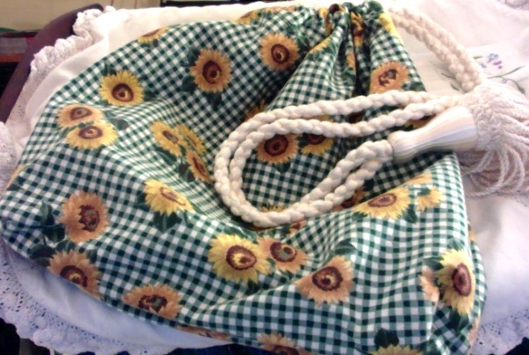 I’m pretty tuckered out this evening (was up way too late last night),and cannot must the energy to create something new, so I’ll share something older again. This is a cute bag I made from a valance curtain that someone gave me. The drawstring is a cord that I had hanging about for ages. EnJoy!