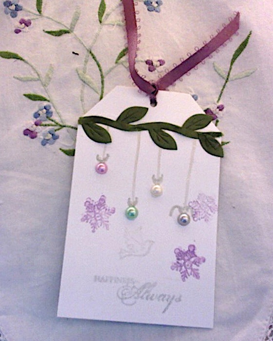 I made a quick little gift tag, inspired by Gi Kerr of Happiness in Crafting, using some pretty flat-back pearls to make hanging ornaments. Aren’t they pretty? I goofed up on the “ribbon” above one bauble; oh, well. Next time will be better. EnJoy!