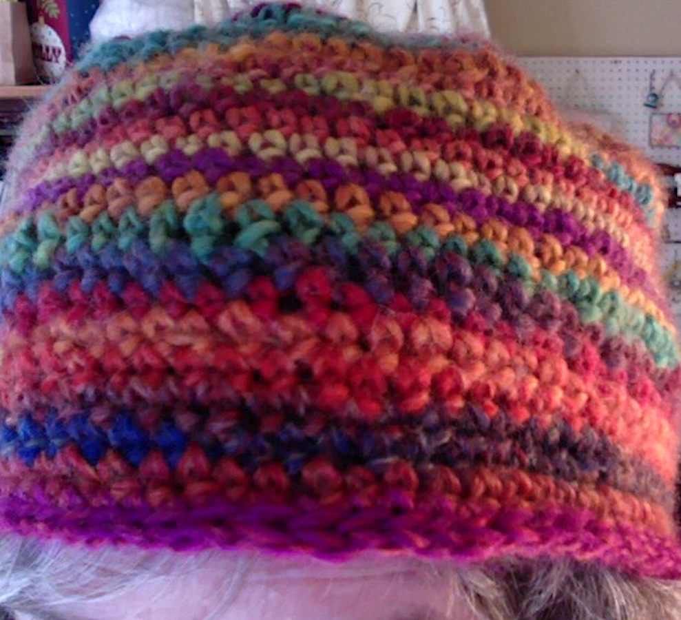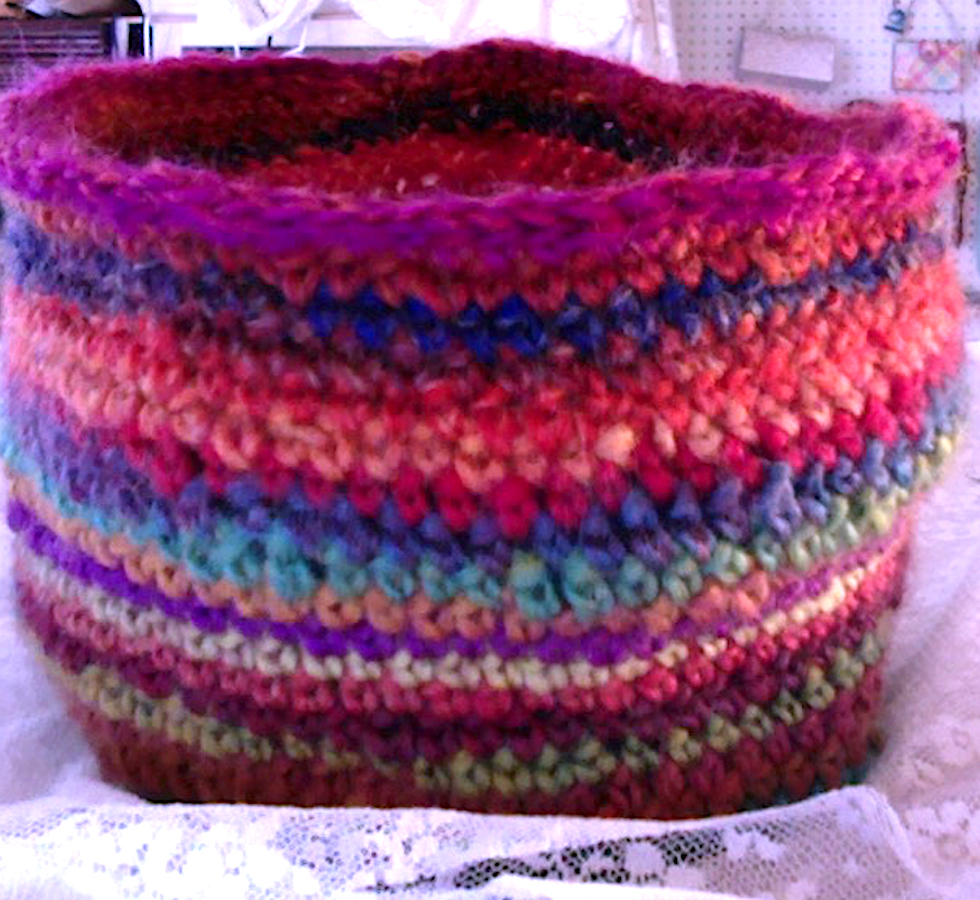 Another finished UFO! I started this crochet basket last year some time, then put it aside for a while. Finally hauled it out and completed it! Yes, I goofed a bit and one side bulges out where it shouldn’t; I decided not to rip and fix, too much work. It could be a hat, too! EnJoy!